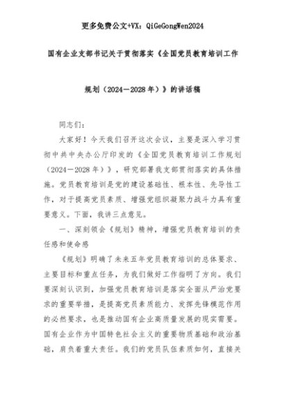 【七哥公文】2025年:国有企业支部书记关于贯彻落实《全国党员教育培训工作规划(2024-2028年)》的讲话稿+更多免费公文+VX:QiGeGongWen2024+更多免费公文+VX:QiGeGongWen2024