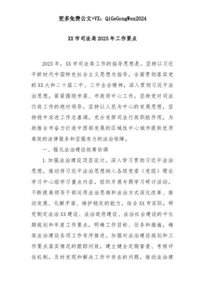 【七哥公文】2025年:XX市司法局2025年工作要点+更多免费公文+VX:QiGeGongWen2024+更多免费公文+VX:QiGeGongWen2024