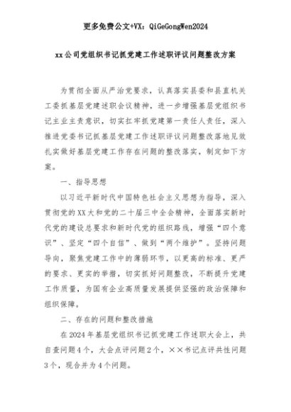 【七哥公文】2025年:xx公司党组织书记抓党建工作述职评议问题整改方案+更多免费公文+VX:QiGeGongWen2024+更多免费公文+VX:QiGeGongWen2024