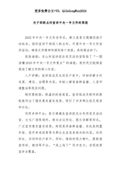 【七哥公文】2025年:关于到联点村宣讲中央一号文件的简报+更多免费公文+VX:QiGeGongWen2024+更多免费公文+VX:QiGeGongWen2024