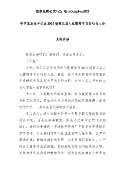 【七哥公文】2025年:中学党总支书记在2025届高三成人礼暨高考百日动员大会上的讲话+更多免费公文+VX:QiGeGongWen2024+更多免费公文+VX:QiGeGongWen2024