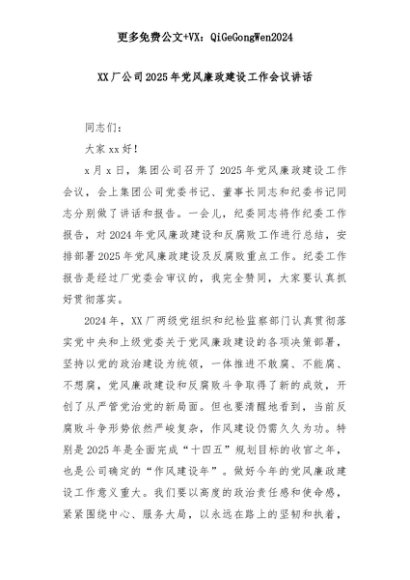 【七哥公文】2025年:XX厂公司2025年党风廉政建设工作会议讲话+更多免费公文+VX:QiGeGongWen2024+更多免费公文+VX:QiGeGongWen2024
