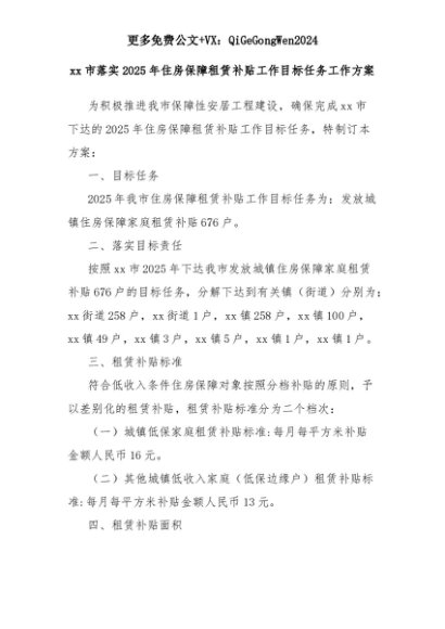 【七哥公文】2025年:xx市落实2025年住房保障租赁补贴工作目标任务工作方案+更多免费公文+VX:QiGeGongWen2024+更多免费公文+VX:QiGeGongWen2024