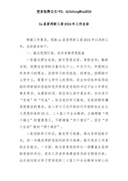 【七哥公文】2025年:Xx县委两新工委2024年工作总结+更多免费公文+VX:QiGeGongWen2024+更多免费公文+VX:QiGeGongWen2024