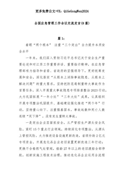 【七哥公文】2025年:(8篇)全国应急管理工作会议交流发言+更多免费公文+VX:QiGeGongWen2024+更多免费公文+VX:QiGeGongWen2024