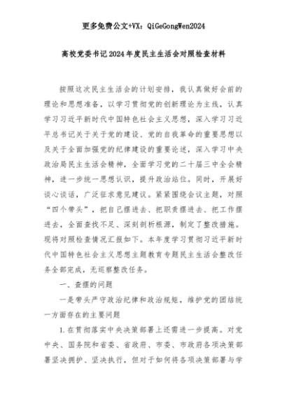 【七哥公文】2025年:高校党委书记2024年度民主生活会对照检查材料+更多免费公文+VX:QiGeGongWen2024+更多免费公文+VX:QiGeGongWen2024