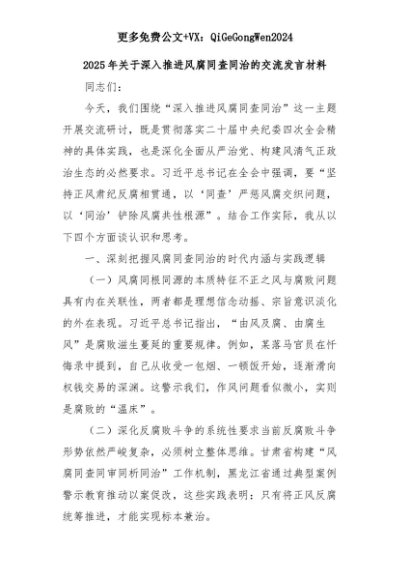 【七哥公文】2025年:2025年关于深入推进风腐同查同治的交流发言材料+更多免费公文+VX:QiGeGongWen2024+更多免费公文+VX:QiGeGongWen2024