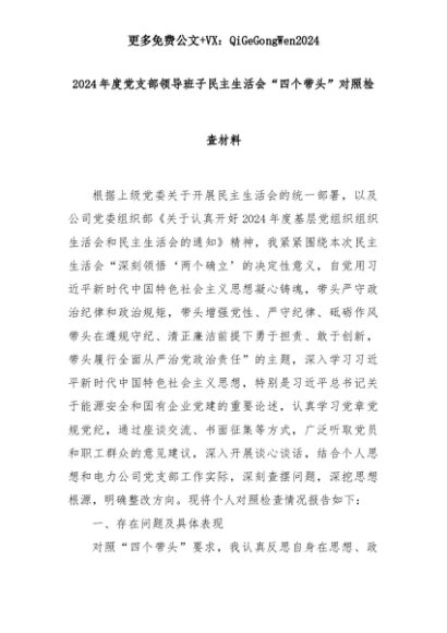 【七哥公文】2025年:2024年度党支部领导班子民主生活会“四个带头”对照检查材料+更多免费公文+VX:QiGeGongWen2024+更多免费公文+VX:QiGeGongWen2024