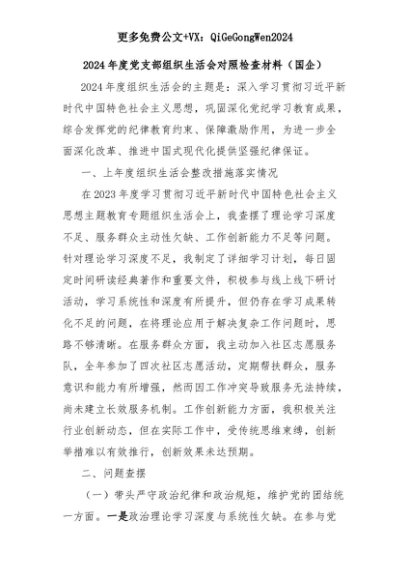 【七哥公文】2025年:2024年度党支部组织生活会对照检查材料(国企)+更多免费公文+VX:QiGeGongWen2024+更多免费公文+VX:QiGeGongWen2024