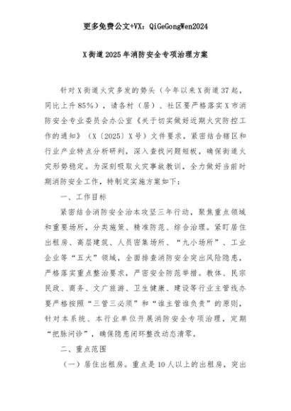 【七哥公文】2025年:X街道2025年消防安全专项治理方案+更多免费公文+VX:QiGeGongWen2024+更多免费公文+VX:QiGeGongWen2024