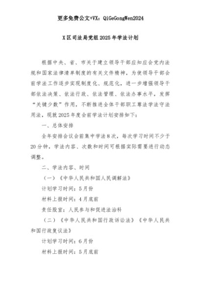 【七哥公文】2025年:X区司法局党组2025年学法计划+更多免费公文+VX:QiGeGongWen2024+更多免费公文+VX:QiGeGongWen2024