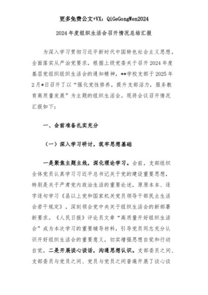 【七哥公文】2025年:2024年度组织生活会召开情况总结汇报+更多免费公文+VX:QiGeGongWen2024+更多免费公文+VX:QiGeGongWen2024