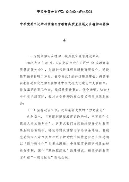 【七哥公文】2025年:中学党委书记学习贯彻X省教育高质量发展大会精神心得体会+更多免费公文+VX:QiGeGongWen2024+更多免费公文+VX:QiGeGongWen2024