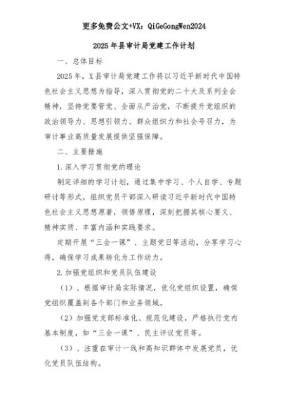 【七哥公文】2025年:2025年县审计局党建工作计划+更多免费公文+VX:QiGeGongWen2024+更多免费公文+VX:QiGeGongWen2024
