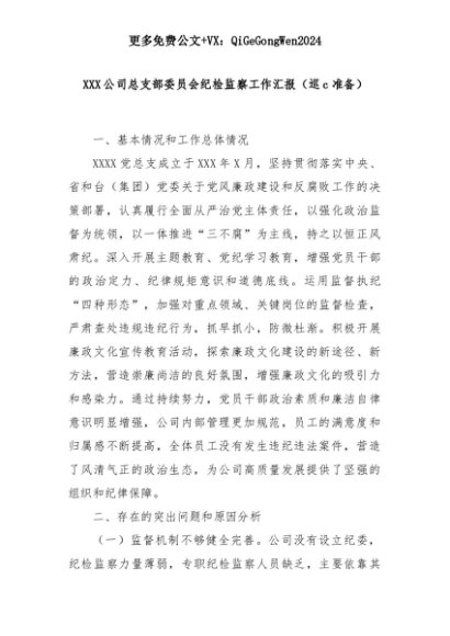 【七哥公文】2025年:(巡察准备)XXX公司总支部委员会纪检监察工作汇报+更多免费公文+VX:QiGeGongWen2024+更多免费公文+VX:QiGeGongWen2024