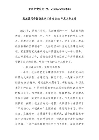 【七哥公文】2025年:某某县纪委监委党务工作者2024年度工作总结+更多免费公文+VX:QiGeGongWen2024+更多免费公文+VX:QiGeGongWen2024