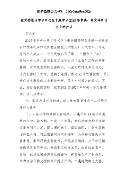 【七哥公文】2025年:在党委理论学习中心组专题学习2025年中央一号文件研讨会上的讲话+更多免费公文+VX:QiGeGongWen2024+更多免费公文+VX:QiGeGongWen2024