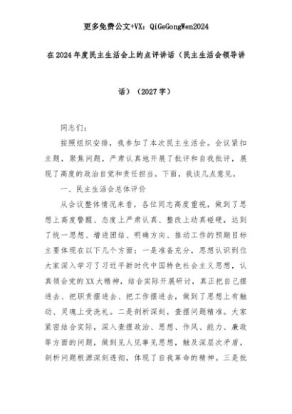 【七哥公文】2025年:在2024年度民主生活会上的点评讲话(民主生活会领导讲话)(2027字)+更多免费公文+VX:QiGeGongWen2024+更多免费公文+VX:QiGeGongWen2024