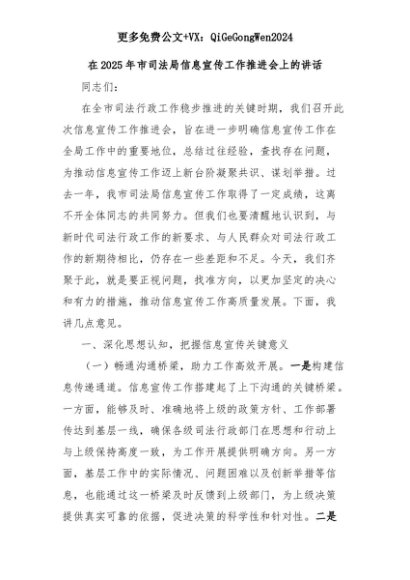 【七哥公文】2025年:在2025年市司法局信息宣传工作推进会上的讲话+更多免费公文+VX:QiGeGongWen2024+更多免费公文+VX:QiGeGongWen2024