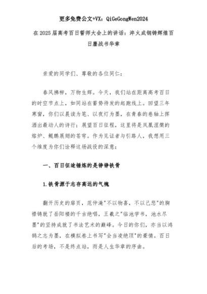【七哥公文】2025年:在2025届高考百日誓师大会上的讲话:淬火成钢铸辉煌百日鏖战书华章+更多免费公文+VX:QiGeGongWen2024+更多免费公文+VX:QiGeGongWen2024
