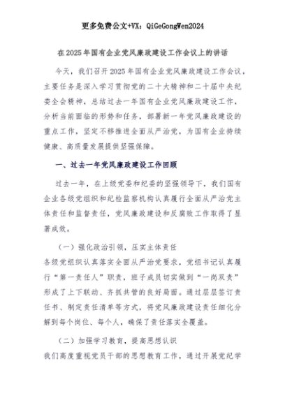 【七哥公文】2025年:在2025年国有企业党风廉政建设工作会议上的讲话+更多免费公文+VX:QiGeGongWen2024+更多免费公文+VX:QiGeGongWen2024