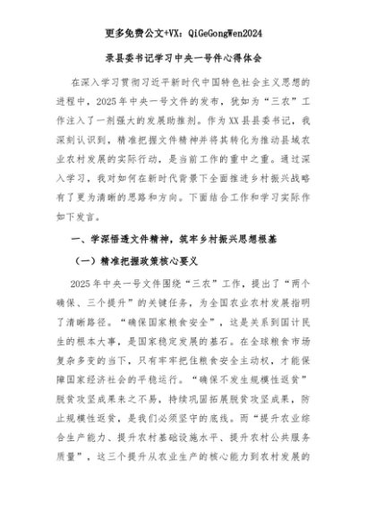 【七哥公文】2025年:录县委书记学习中央一号件心得体会+更多免费公文+VX:QiGeGongWen2024+更多免费公文+VX:QiGeGongWen2024