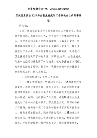 【七哥公文】2025年:卫健委主任在2025年全县免疫规划工作推进会上的部署讲话+更多免费公文+VX:QiGeGongWen2024+更多免费公文+VX:QiGeGongWen2024