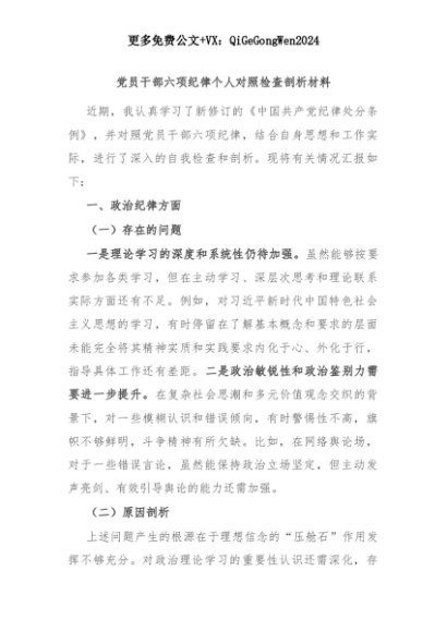 【七哥公文】2025年:党员干部六项纪律个人对照检查剖析材料+更多免费公文+VX:QiGeGongWen2024+更多免费公文+VX:QiGeGongWen2024