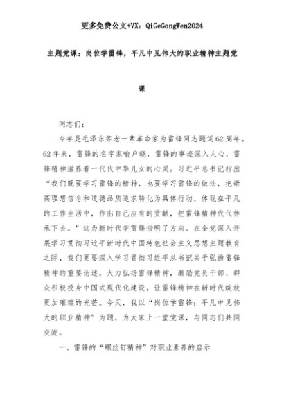【七哥公文】2025年:主题党课:岗位学雷锋,平凡中见伟大的职业精神主题党课+更多免费公文+VX:QiGeGongWen2024+更多免费公文+VX:QiGeGongWen2024