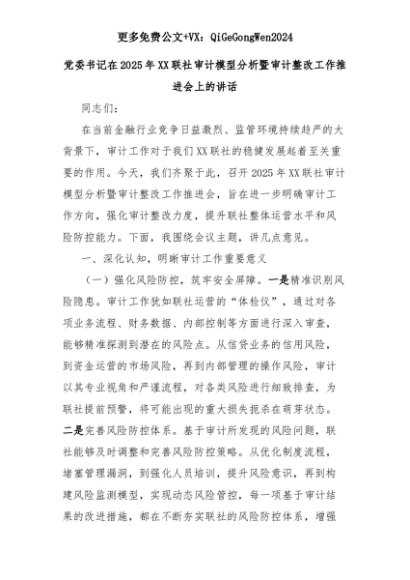 【七哥公文】2025年:党委书记在2025年XX联社审计模型分析暨审计整改工作推进会上的讲话+更多免费公文+VX:QiGeGongWen2024+更多免费公文+VX:QiGeGongWen2024