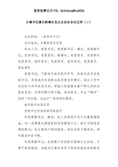 【七哥公文】2025年:乡镇书记镇长副镇长民主生活会会议记录(二)+更多免费公文+VX:QiGeGongWen2024+更多免费公文+VX:QiGeGongWen2024