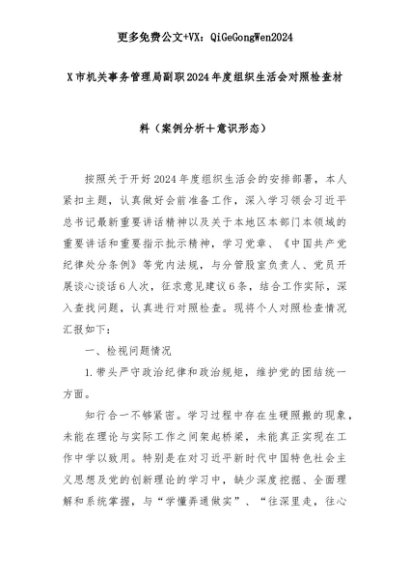 【七哥公文】2025年:X市机关事务管理局副职2024年度组织生活会对照检查材料(案例分析+意识形态)+更多免费公文+VX:QiGeGongWen2024+更多免费公文+VX:QiGeGongWen2024