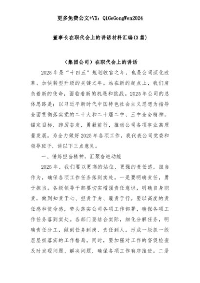 【七哥公文】2025年:(3篇)董事长在职代会上的讲话材料汇编+更多免费公文+VX:QiGeGongWen2024+更多免费公文+VX:QiGeGongWen2024