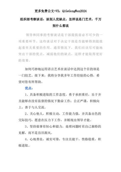 【七哥公文】2025年:组织部考察谈话:谈别人优缺点,怎样说是门艺术,千万别什么都说+更多免费公文+VX:QiGeGongWen2024+更多免费公文+VX:QiGeGongWen2024