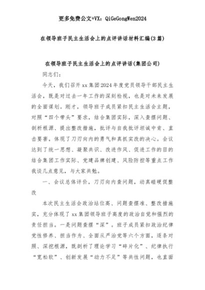 【七哥公文】2025年:(3篇)在领导班子民主生活会上的点评讲话材料汇编+更多免费公文+VX:QiGeGongWen2024+更多免费公文+VX:QiGeGongWen2024