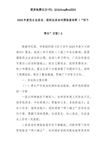 【七哥公文】2025年:2024年度民主生活会、组织生活会对照检查材料(“四个带头”方面)2+更多免费公文+VX:QiGeGongWen2024+更多免费公文+VX:QiGeGongWen2024