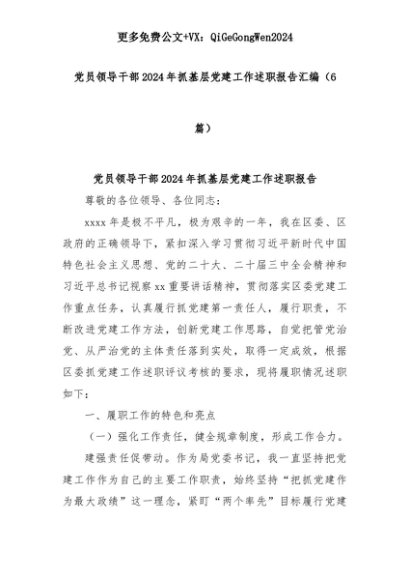 【七哥公文】2025年:(6篇)党员领导干部2024年抓基层党建工作述职报告汇编+更多免费公文+VX:QiGeGongWen2024+更多免费公文+VX:QiGeGongWen2024