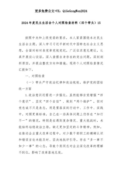 【七哥公文】2025年:2024年度民主生活会个人对照检查材料(四个带头)15+更多免费公文+VX:QiGeGongWen2024+更多免费公文+VX:QiGeGongWen2024