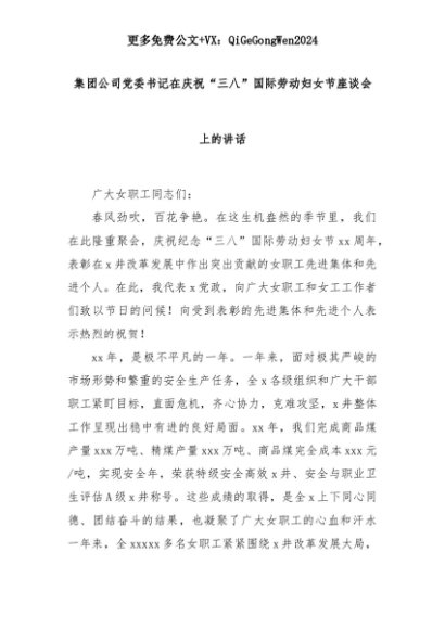 【七哥公文】2025年:集团公司党委书记在庆祝“三八”国际劳动妇女节座谈会上的讲话+更多免费公文+VX:QiGeGongWen2024+更多免费公文+VX:QiGeGongWen2024