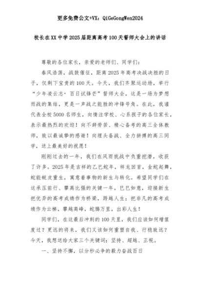 【七哥公文】2025年:校长在XX中学2025届距离高考100天誓师大会上的讲话+更多免费公文+VX:QiGeGongWen2024+更多免费公文+VX:QiGeGongWen2024