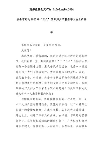 【七哥公文】2025年:在全市纪念2025年“三八”国际妇女节暨表彰大会上的讲话+更多免费公文+VX:QiGeGongWen2024+更多免费公文+VX:QiGeGongWen2024