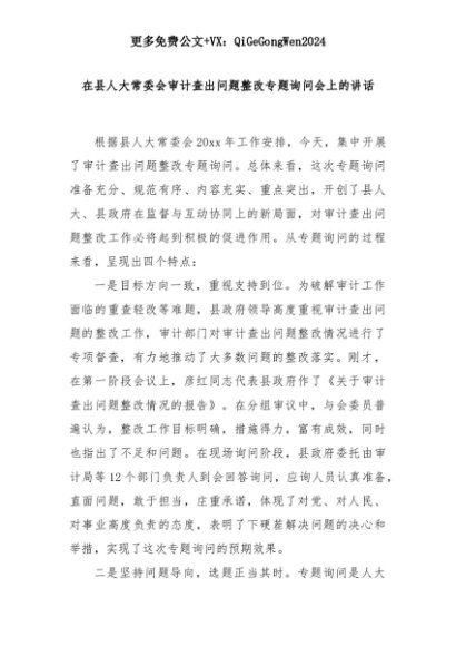 【七哥公文】2025年:在县人大常委会审计查出问题整改专题询问会上的讲话+更多免费公文+VX:QiGeGongWen2024+更多免费公文+VX:QiGeGongWen2024