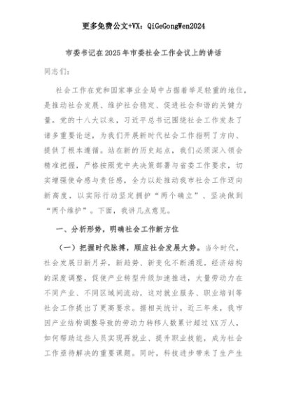 【七哥公文】2025年:市委书记在2025年市委社会工作会议上的讲话+更多免费公文+VX:QiGeGongWen2024+更多免费公文+VX:QiGeGongWen2024