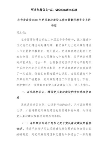 【七哥公文】2025年:在市发改委2025年党风廉政建设工作会暨警示教育会上的讲话+更多免费公文+VX:QiGeGongWen2024+更多免费公文+VX:QiGeGongWen2024