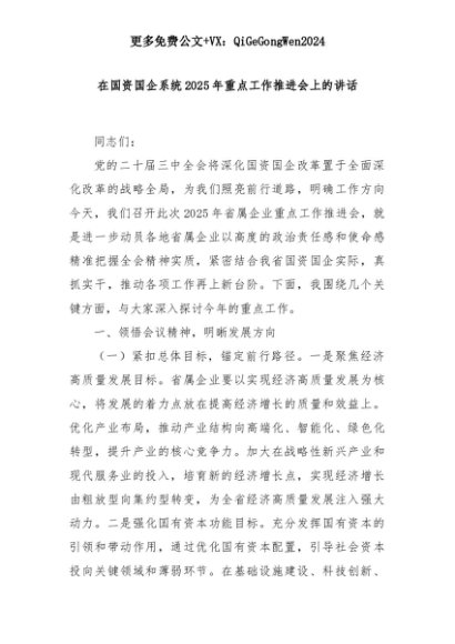 【七哥公文】2025年:在国资国企系统2025年重点工作推进会上的讲话+更多免费公文+VX:QiGeGongWen2024+更多免费公文+VX:QiGeGongWen2024