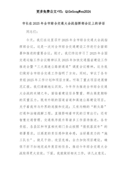 【七哥公文】2025年:市长在2025年全市综合交通大会战指挥部会议上的讲话+更多免费公文+VX:QiGeGongWen2024+更多免费公文+VX:QiGeGongWen2024
