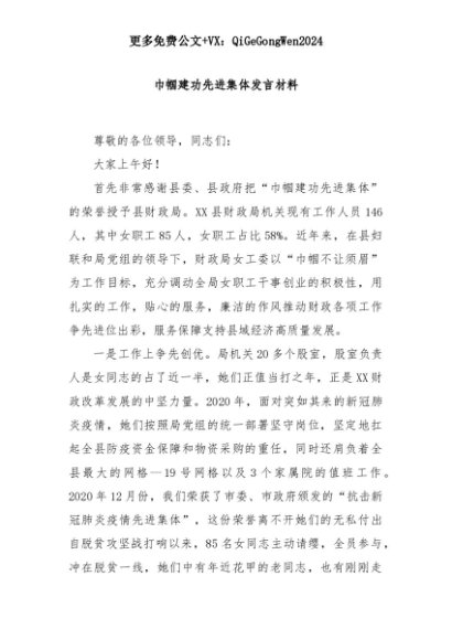 【七哥公文】2025年:巾帼建功先进集体发言材料+更多免费公文+VX:QiGeGongWen2024+更多免费公文+VX:QiGeGongWen2024