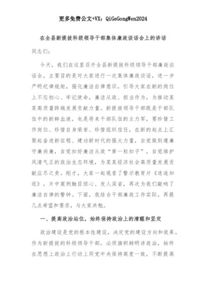 【七哥公文】2025年:在全县新提拔科级领导干部集体廉政谈话会上的讲话+更多免费公文+VX:QiGeGongWen2024+更多免费公文+VX:QiGeGongWen2024