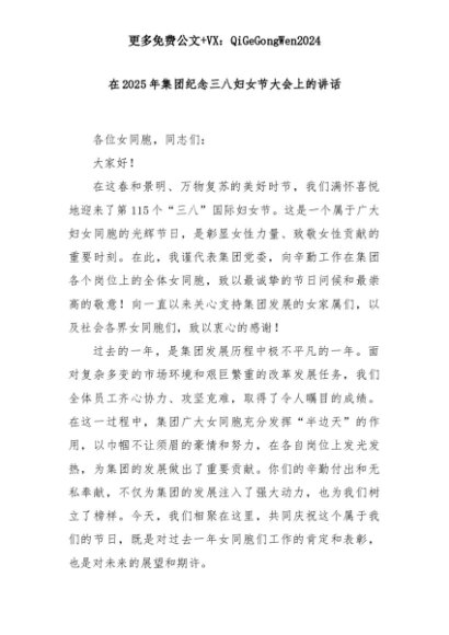 【七哥公文】2025年:在2025年集团纪念三八妇女节大会上的讲话+更多免费公文+VX:QiGeGongWen2024+更多免费公文+VX:QiGeGongWen2024