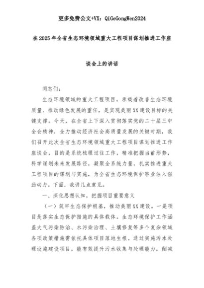 【七哥公文】2025年:在2025年全省生态环境领域重大工程项目谋划推进工作座谈会上的讲话+更多免费公文+VX:QiGeGongWen2024+更多免费公文+VX:QiGeGongWen2024